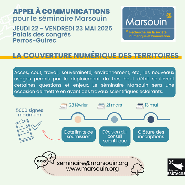 Jusqu’au 13 mai 2024 inclus, l’inscription est gratuite pour les membres Marsouin et d’un montant de 130€ pour les extérieur.e.s. Les étudiants bénéficient d’un tarif à 80€.